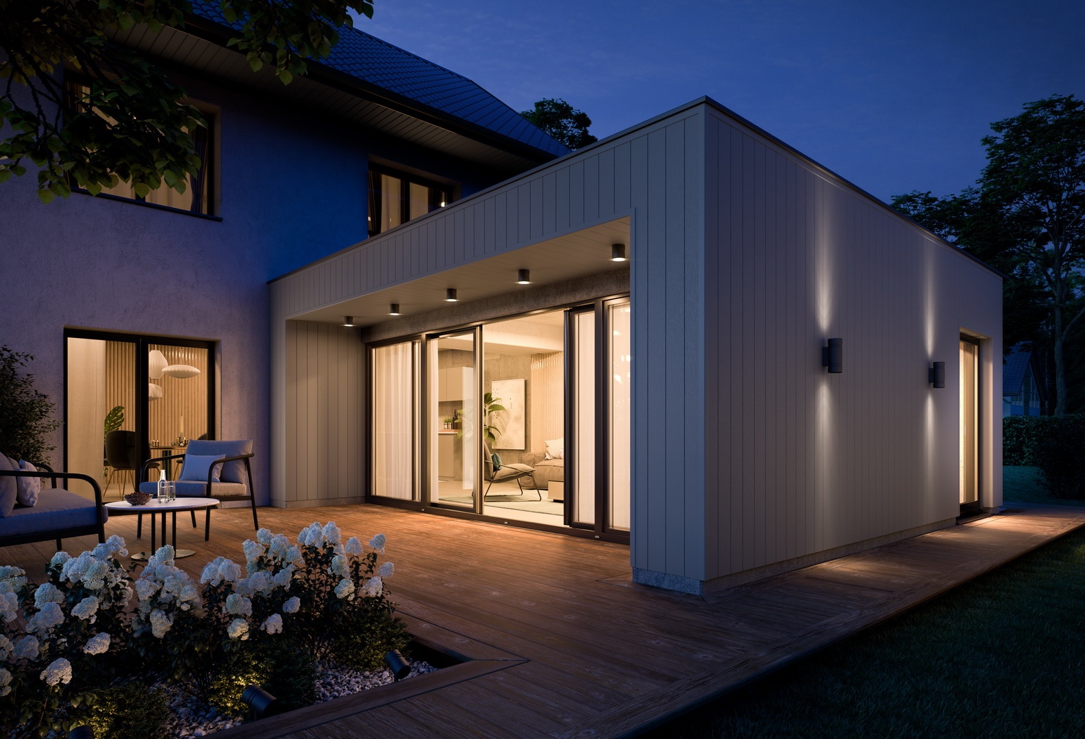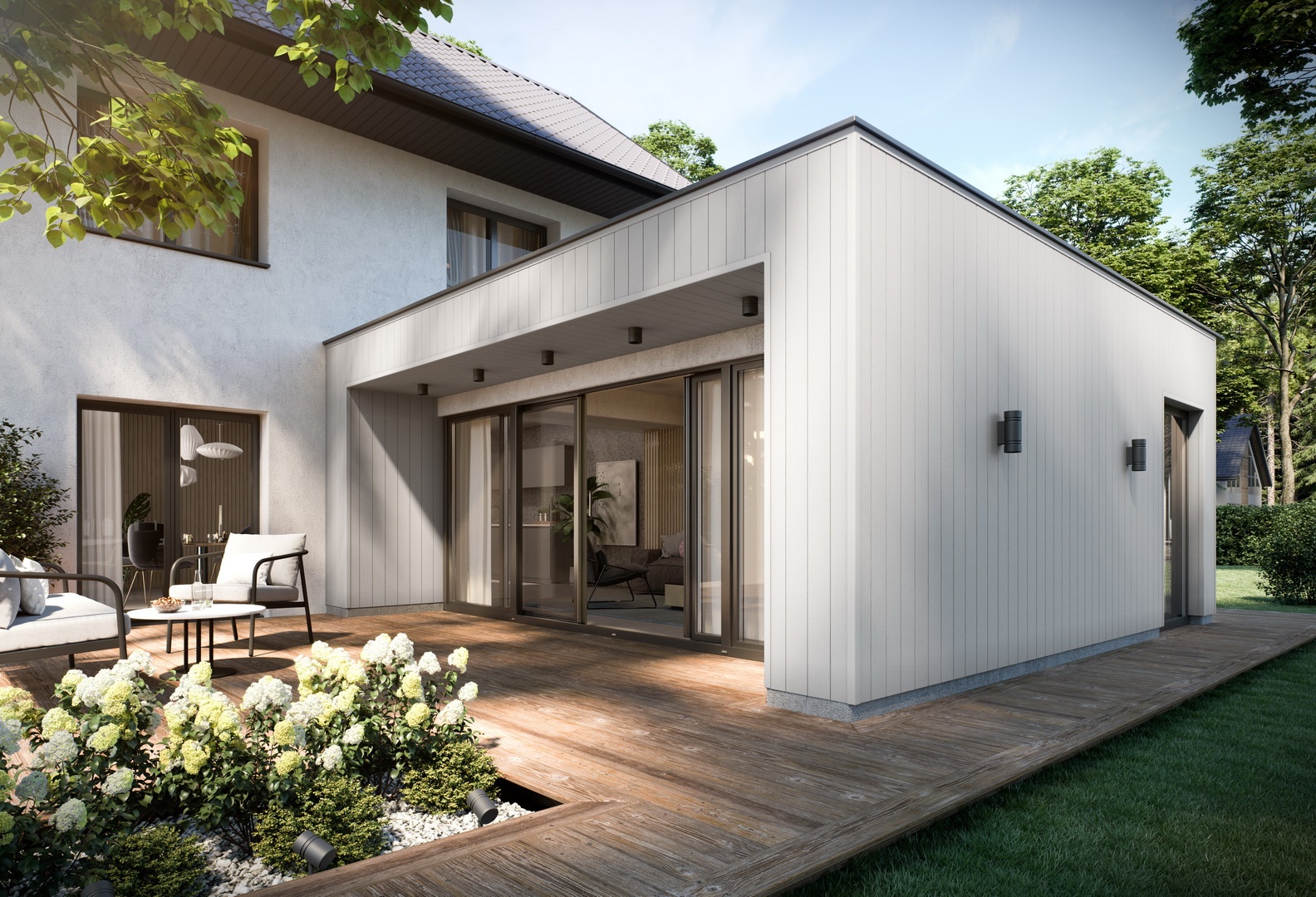 Fasádny systém DECO SIDING SV 05 - tvar, farba a štruktúra dokonale imitujú jednoduché, široké dosky - fasáda má moderný vzhľad vďaka použitiu plochých panelov - ploché panely je možné inštalovať vertikálne aj horizontálne - fasáda si zachováva farbu a dobrý vzhľad po celé roky.